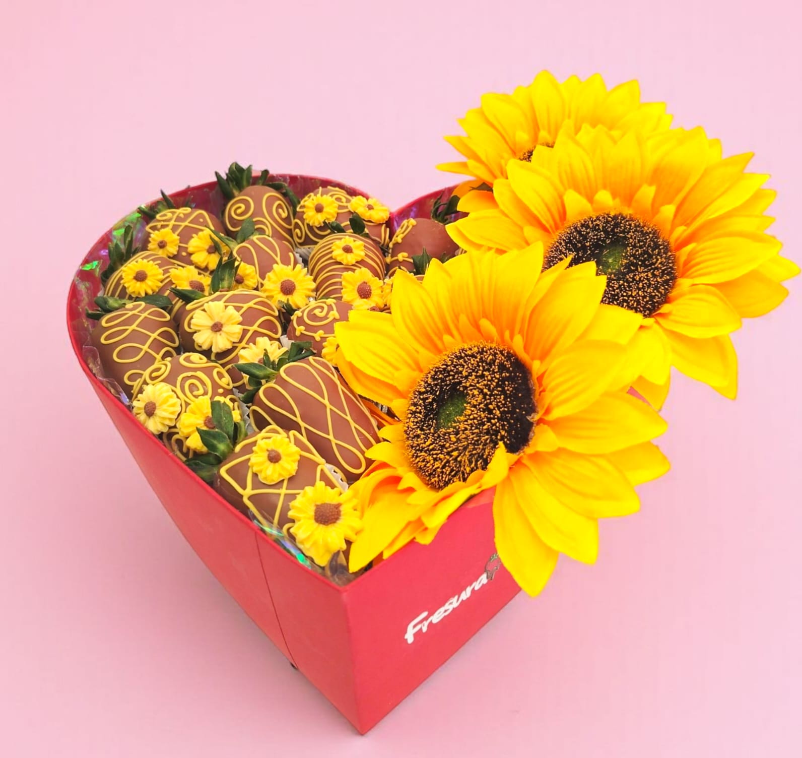 Caja en forma de corazon decorada con girasoles y 16 fresas con chocolate personalizadas.